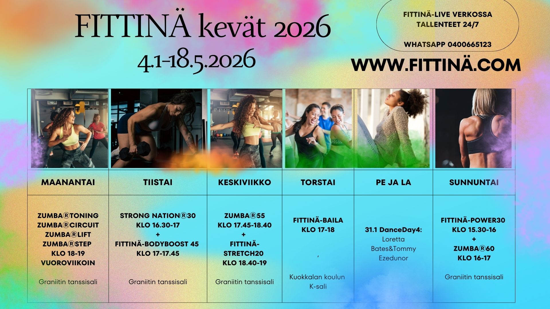HUOMIOITHAN, että Tiina voi pitää lomaa silloin tällöin, jolloin tunteja ei ole TAI TIINALLA ON SIJAINEN. Lisäksi jos Tiina sairastuu, tai on joku muu pakollinen poissaolo, ei tuntia ole. Samoin, jos jollakin tunneilla ei käy riittävästi jumppareita, voidaan tunti lopettaa. Liity Whatsapp-ryhmään 0400665123, niin saat nopeimmin tiedon kaikesta. Peruutukset ja muutokset kannattaa tsekata myös ajankohtaista linkistä.