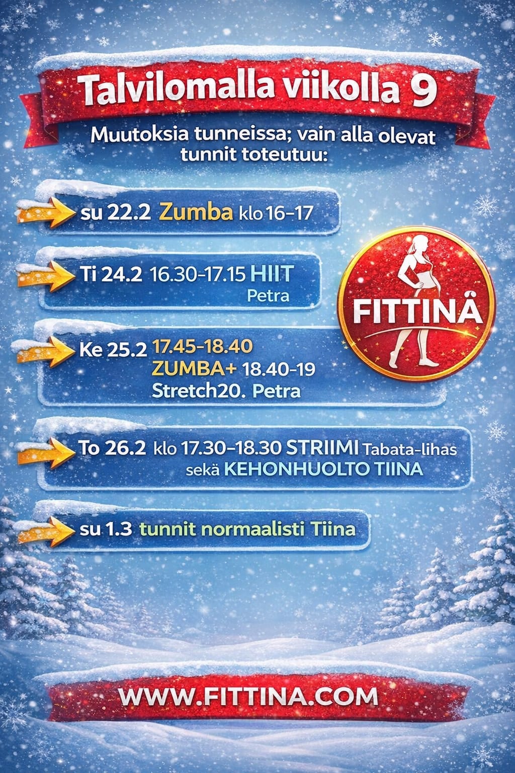 Talvilomalla viikolla 9  muutoksia tunneissa; vain alla olevat tunnit toteutuu;